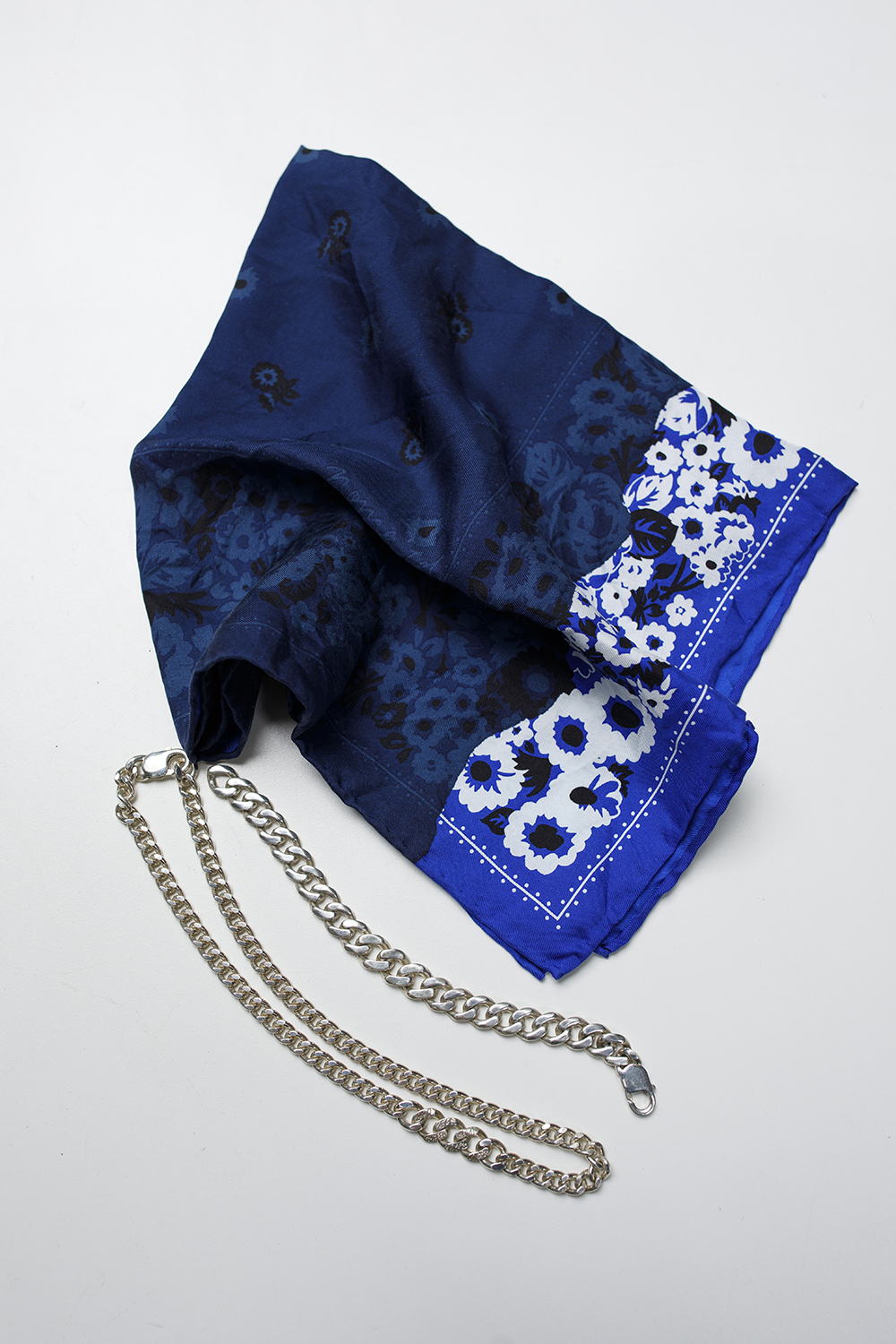 野口さんが普段よく身につけているという、自身のテキスタイルをあしらったスカーフとチェーンのブレスレット&ネックレス。スタイルの細部に彼女らしさが表れている。