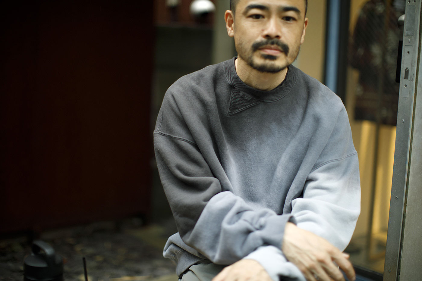 「スウェットの特徴は縫い目をツイストさせていること。染めによって、そのツイストがより斜めに感じられるようなムードを表現しました。ここまでねじれているスウェットはあまりないですよね。シンプルでベーシックなアイテムにちょっとひねりを加えるのがNOMA t.d.の服作りのスタイル。私たち自身も、普段からそのような“情緒”のある服、自分らしいパーソナリティを表現できる服を自然と手に取っている気がします」(野口)