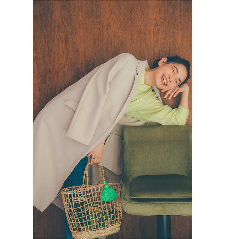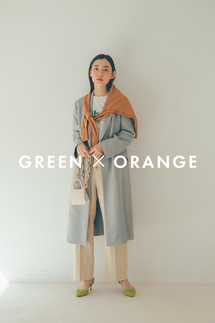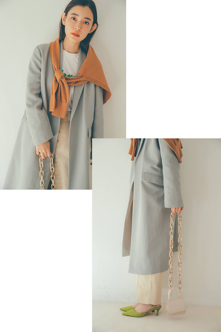 今年らしいミントグリーンのチェスターコートには、ロゴTやパンプスをグリーンで統一させつつ、邪魔をしないベージュのボトムや小物にオレンジブラウンのカ―ディガンをアクセントに肩掛け。遊びのあるアイテムも色の相性次第でしっくり馴染む。