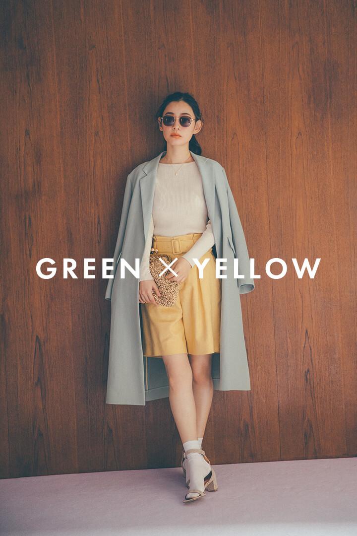 一見ポップな色の組み合わせも、柔らかいグリーンなら馴染みが良い。ショートパンツで脚を出すスタイルも今年はロングコートと合わせてチャレンジしてみたい。小物をベージュ系でまとめればカジュアルに傾かずエレガントな大人のムードが演出できる。
