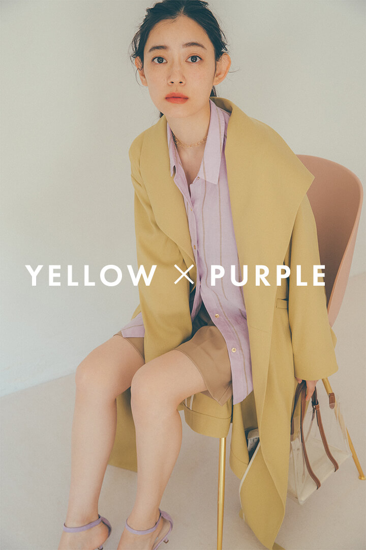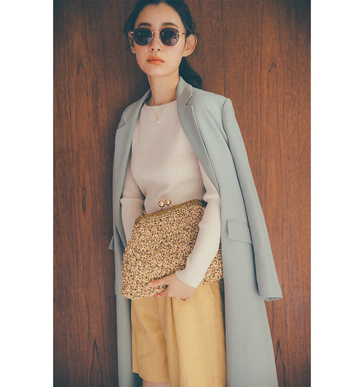 優しいくすみのあるイエローベージュのコートは明るいパープルとも相性が良く、ぐっと今年らしい表情にしてくれるおススメの色合わせ。ショートパンツともバランスが良いロング丈のコートはヌーディーな色によって脚の肌感を強調せず自然な女っぽさを醸し出せる。