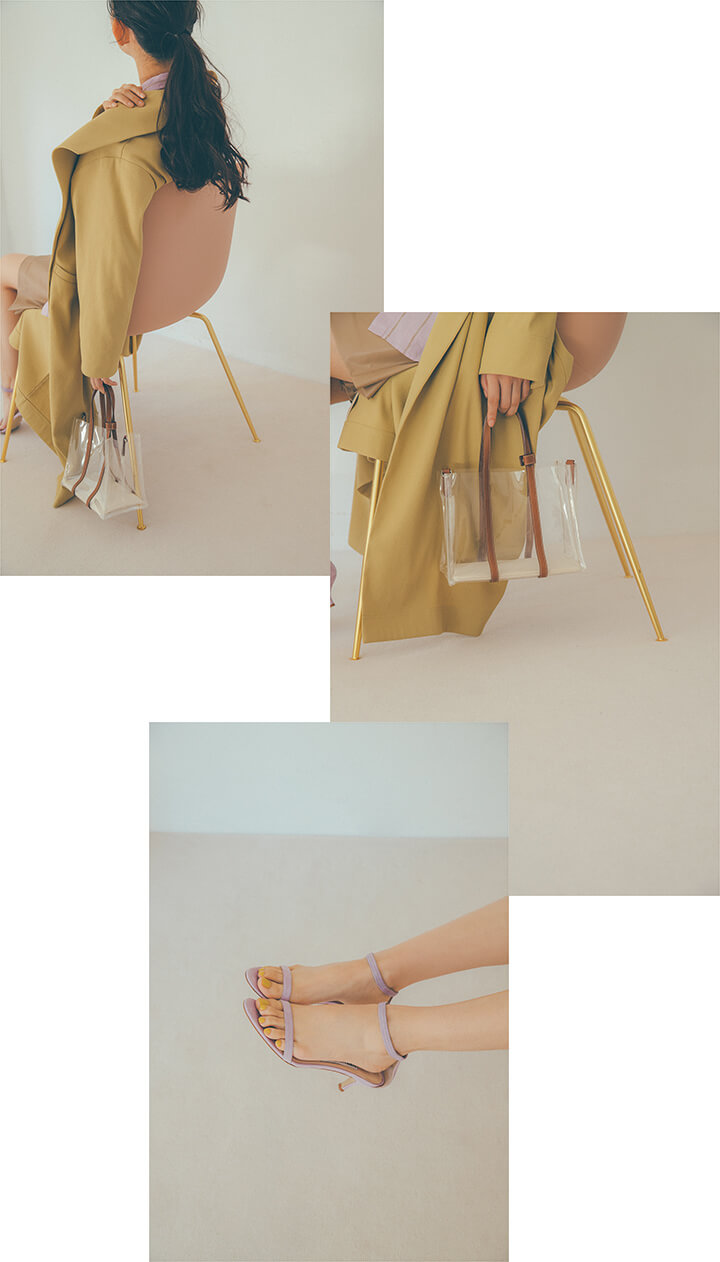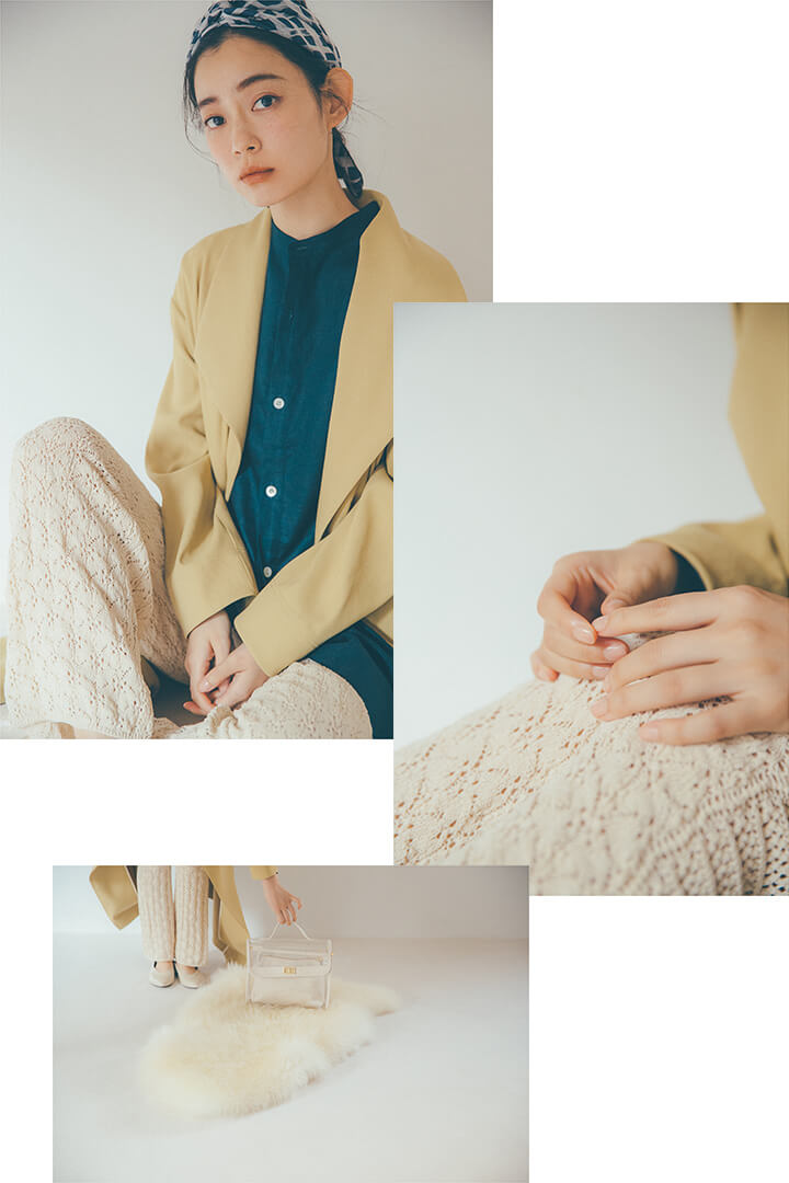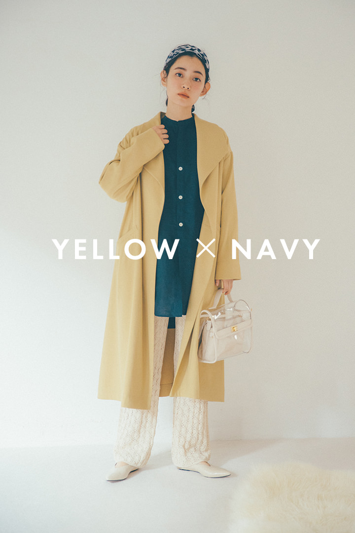 トラッドになりがちなネイビーのアイテムにはコートの優しいイエローを合わせると、柔らかい印象の新しいトラッドスタイルを実現してくれる。レースニットパンツやクリア素材のバックを加えて春らしい軽さを出して。シャツのネイビーと合わせたヘアバンドで、目線を上げるのもスタイルアップの小技。