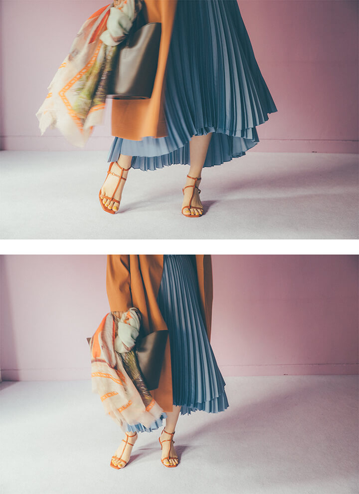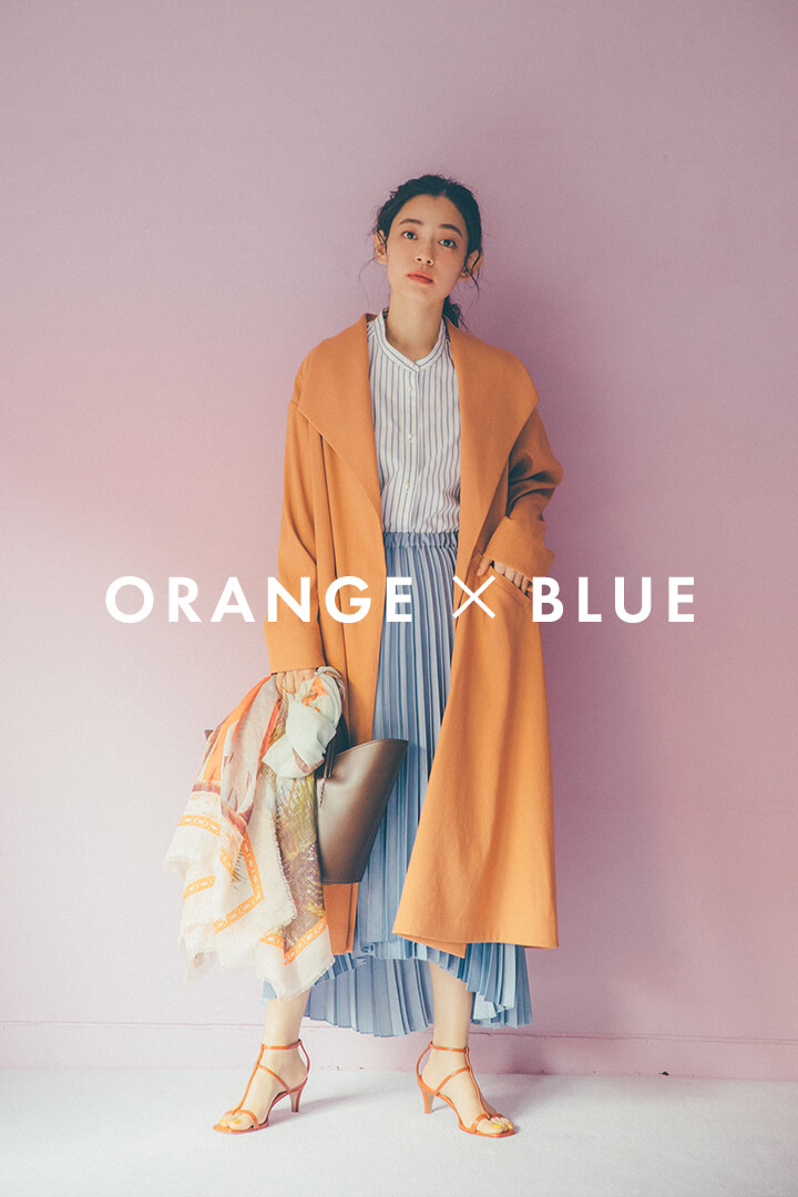 コートの少しブラウンがかった優しいオレンジには、くすんだブルーが相性抜群。ツヤ感のあるアシンメトリーなスカートの裾をロング丈のガウンコートからのぞかせるとぐっと華やかな動きのある着こなしに。ブラウン系の小物と、柔らかいベージュ系のストールが、全体のトーンをまとめてくれる。