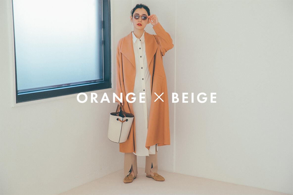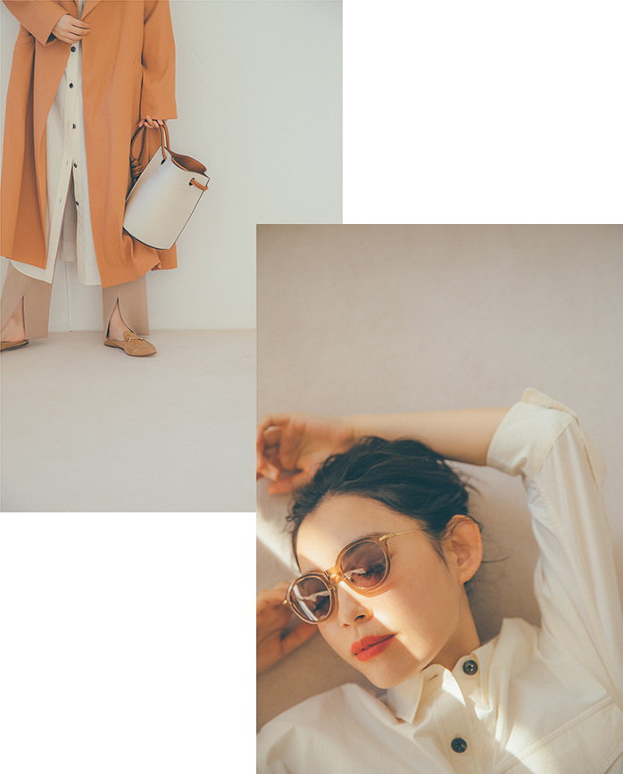 全体をアイボリーからブラウンでまとめたワントーンスタイル。インのシャツワンピは、上までボタンを留めて直線的に着ると、動きのあるガウンコートとの対比が生まれて程よいモード感を演出。ブラウンがかったオレンジコートには、ブラウン系の小物で統一感を。さらに透け感のあるサングラスが良いアクセントに。