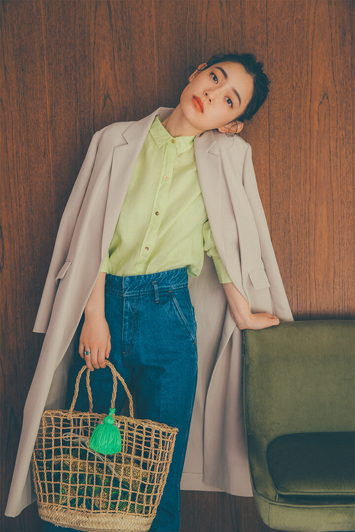 定番のリネンシャツ、今年はナチュラルな素材だからこそ新鮮なネオンカラーにもチャレンジしてみて。バッグなどでトーンを合わせた小物を投入すると全体がしっくりまとまる。遊びのある色合わせの仕上げに柔らかいベージュカラーのコートを羽織れば落ち着きのあるムードに。