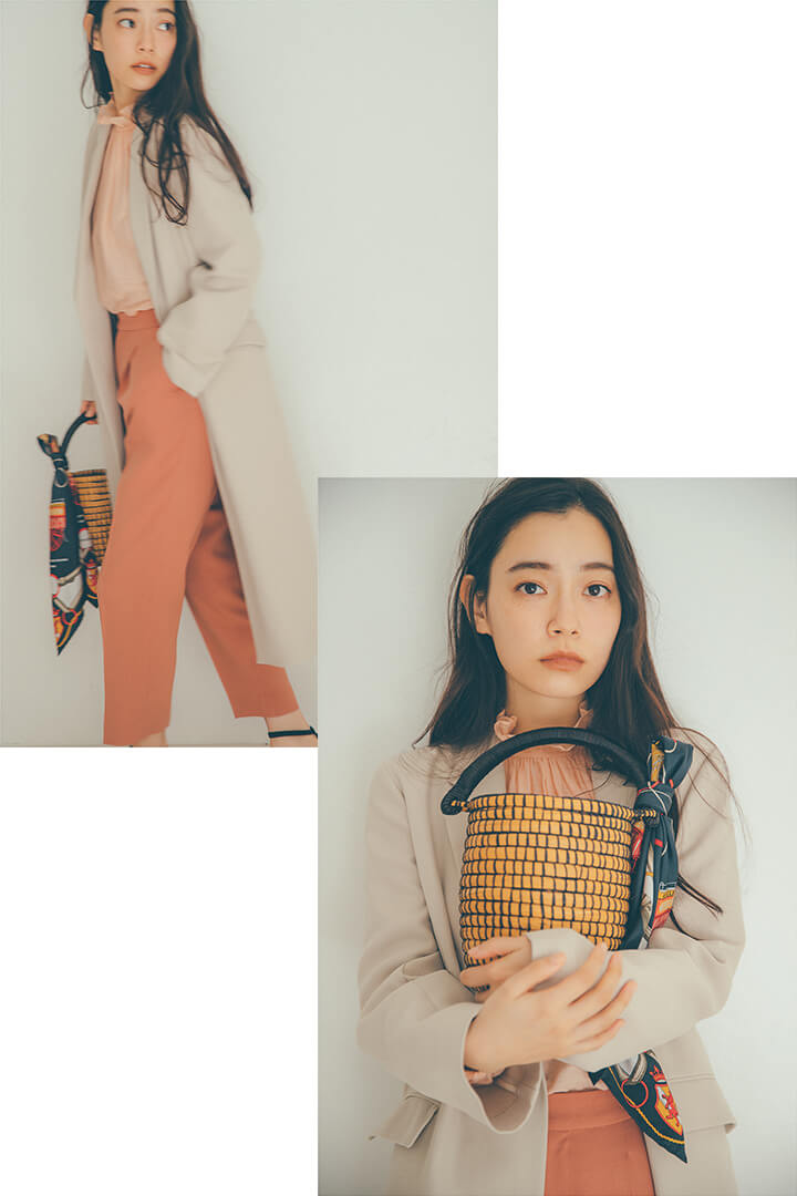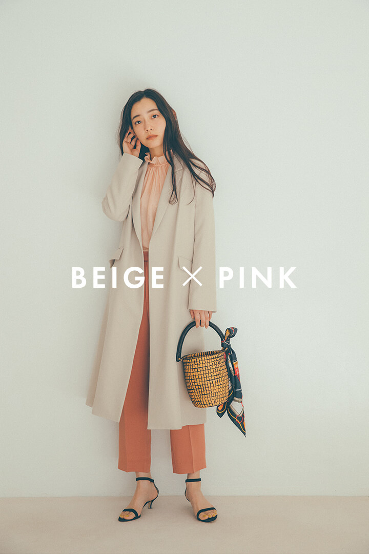 やっぱり安心感のあるベージュは幅広く色を受け止めてくれる。カチっとした印象のチェスターコートと黒の小物でピンクのワントーンの甘い色合わせに、少し大人な要素を加えて。ワントーンには色の濃淡や素材に差をつけることがのっぺりさせないポイント。