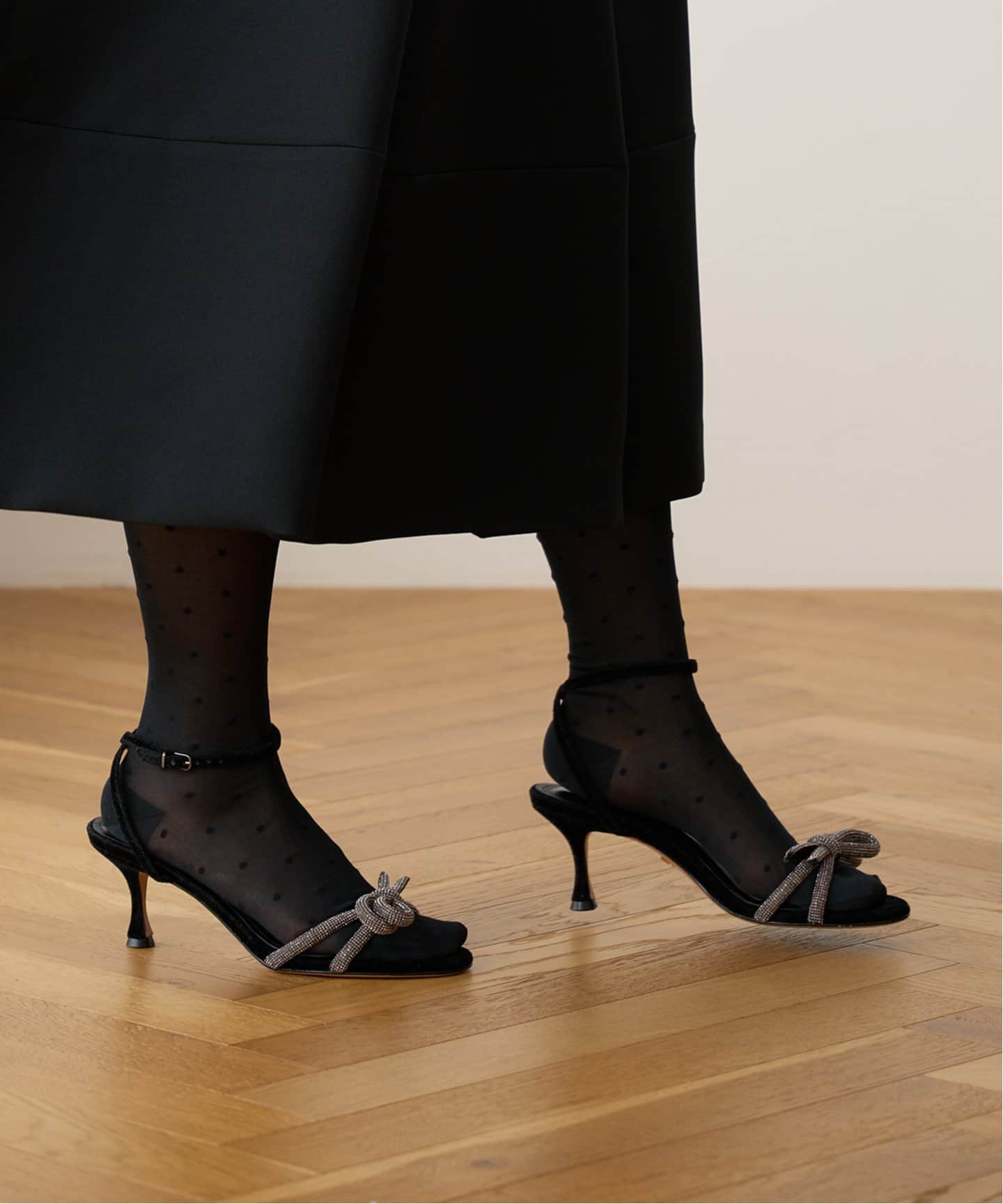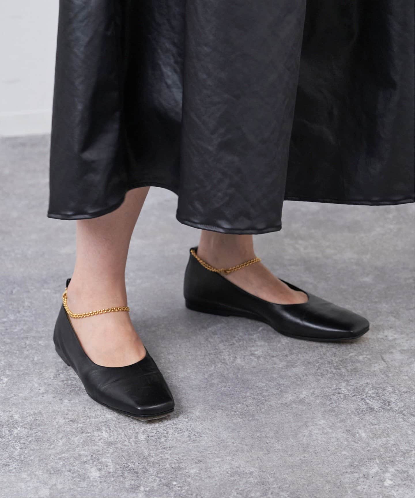 アクセントで差がつく秋シューズクラシカルなムードが台頭している今季は、足元も正統派なデザインが最適解。FABIO RUSCONIのフラットシューズは、上品なベロア素材に加えてゴールドのスクエアパーツが華やか。あえてカジュアルに投入してもOK。