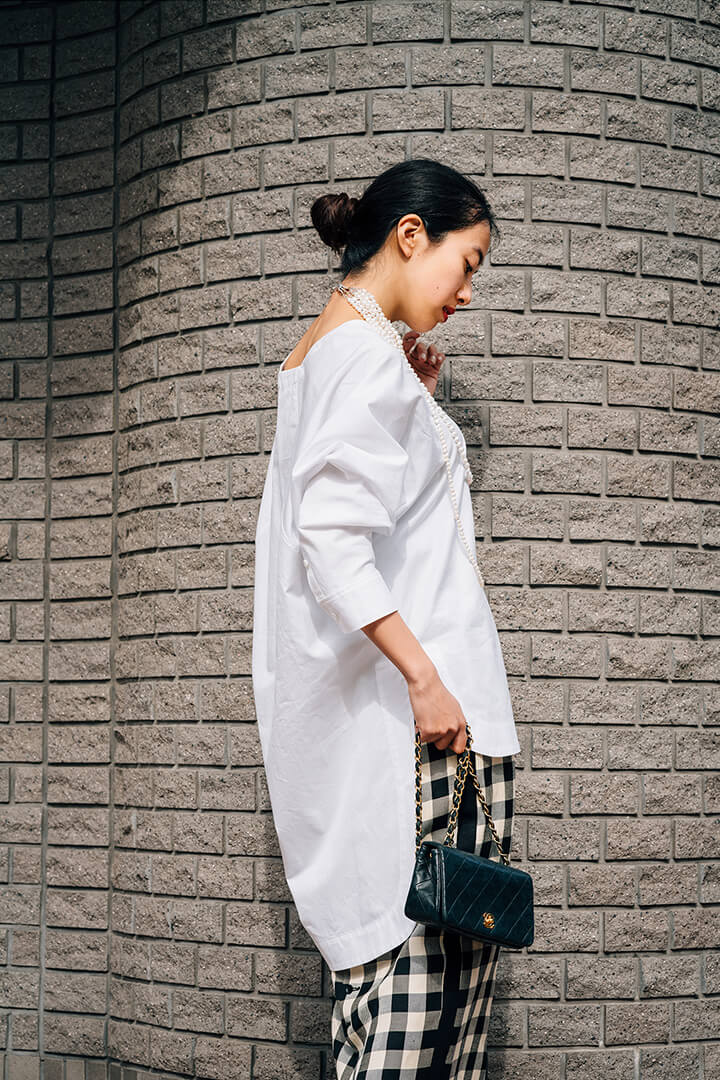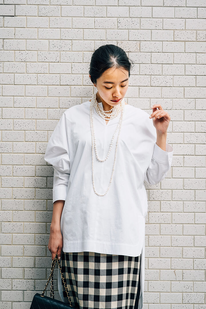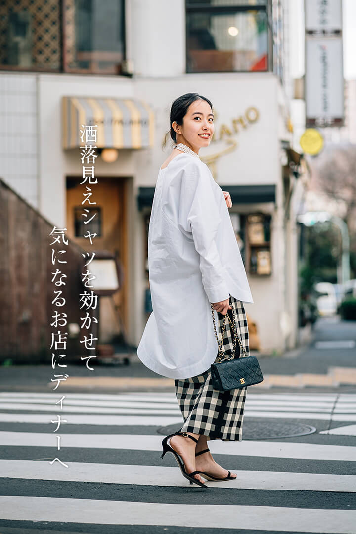 洒落感たっぷりのこなれシャツにキレイめ小物を随所に配して、レディに仕上げて。