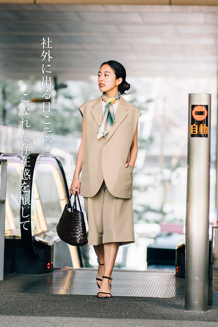 ベージュのセットアップなら、スタイリッシュで知的な雰囲気をキープ。