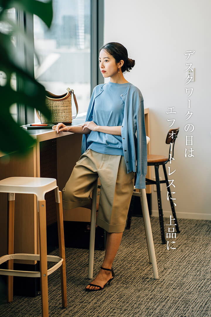 スモーキーブルーのアンサンブルなら、楽な着心地ながら品と華やかさのあるムードが漂います。