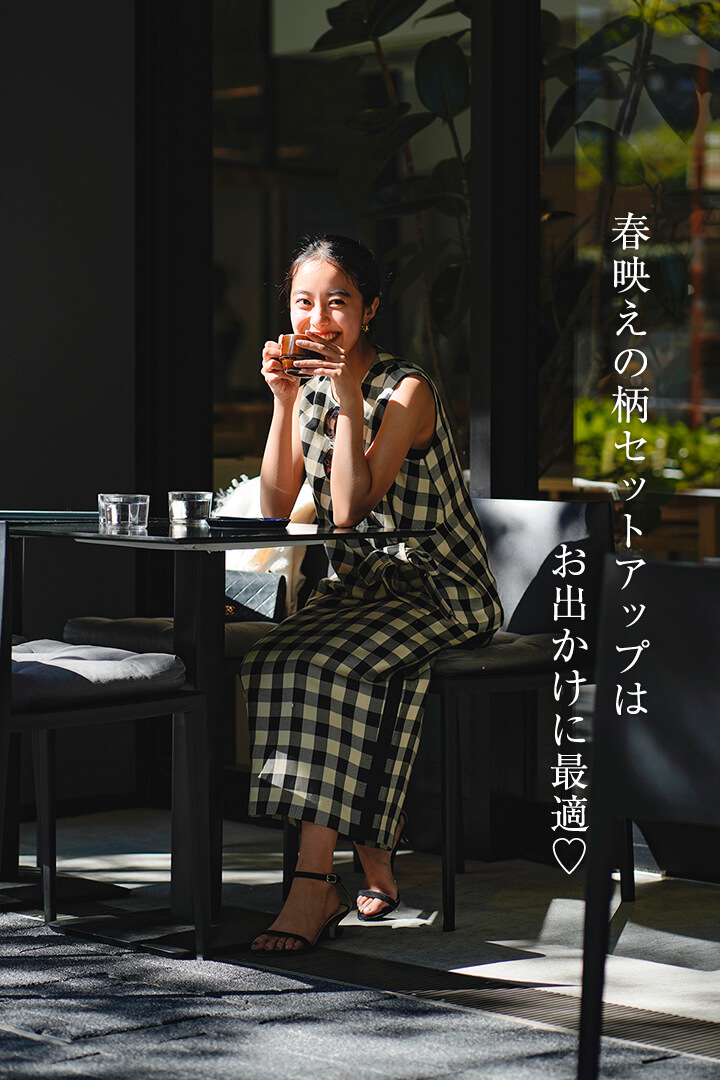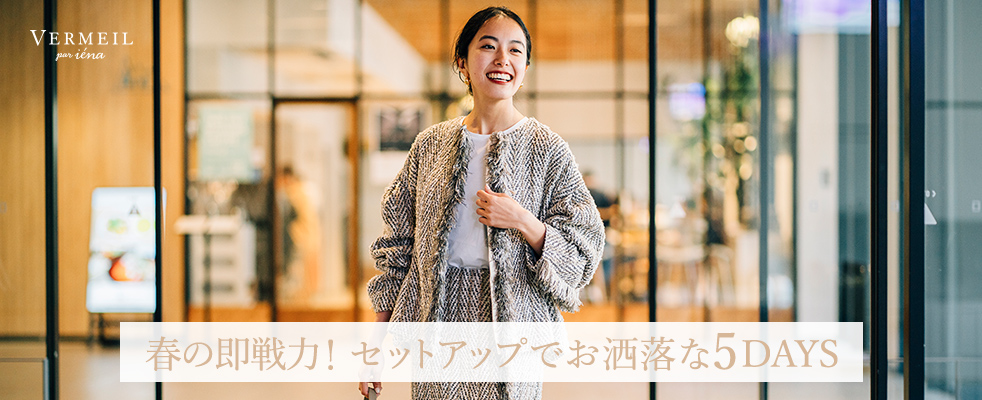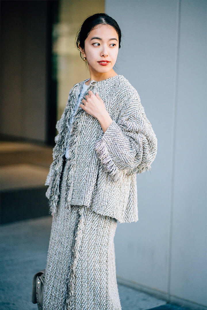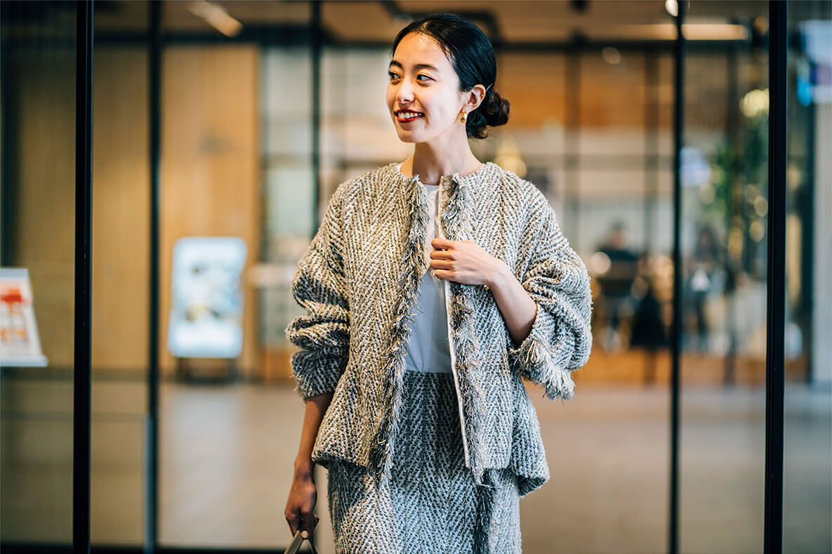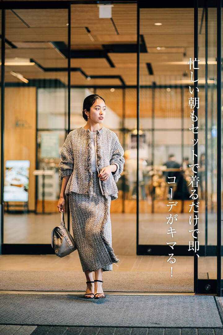 キレイめなツイード素材ならではのセットアップは、セレモニーシーンや会議などの場面でも安心。パンプスを合わせてお仕事モードに、サンダルを合わせて抜け感を演出など、アレンジも楽しめそう。正統派に着こなすのももちろんOKなので、忙しい朝でも悩まずコーデがサマになります。