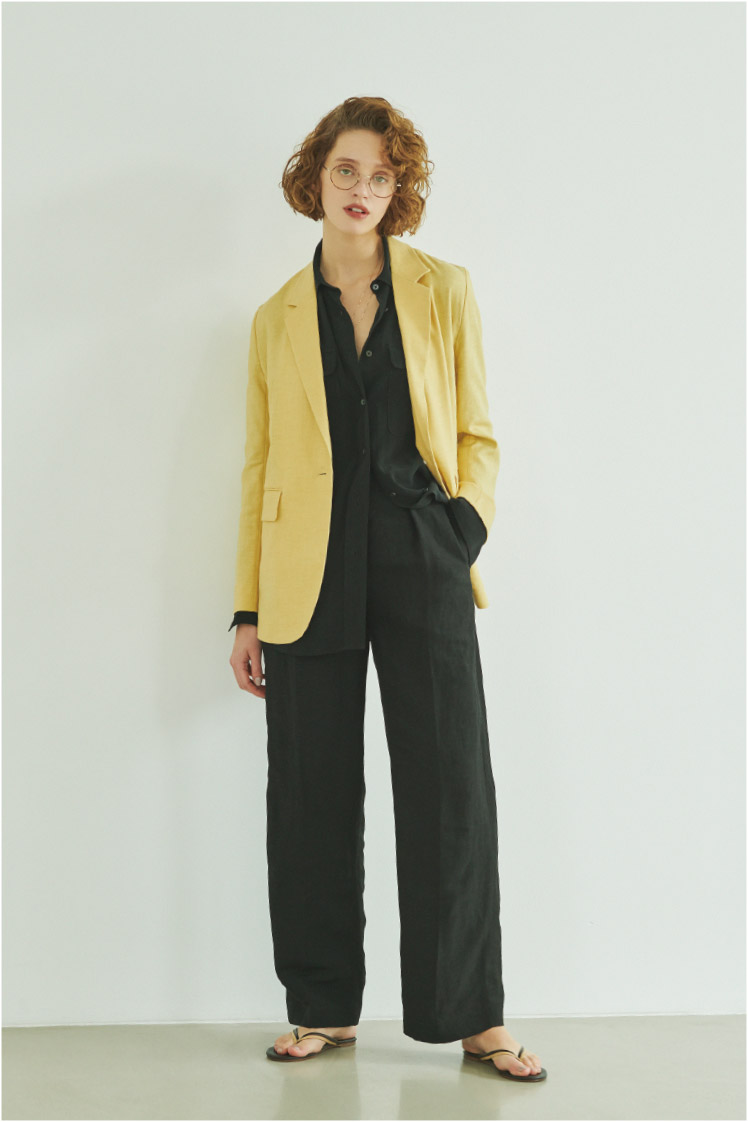 - 最旬カラー、イエローのジャケットを主役に。とろみシャツ×パンツのメンズライクな組み合わせだからこそ、ブラウスのボタンの開け方や裾のあしらいで、女らしいニュアンスを漂わせて。足元は抜け感あるビーサン風サンダルが新鮮。
