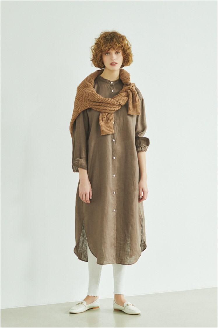 - リラックス感のあるリネンのシャツワンピースに、キャメルカラーのざっくりニットをオン。ブラウンのグラデーションが、品良くおしゃれ見えするコーデにまとめてくれます。ボトムと靴は、白で繋げて軽さを出して。