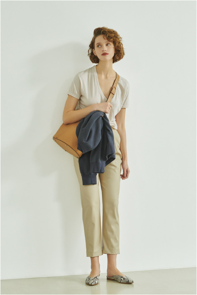 - 履くだけでおしゃれ見えが叶うクリームカラーのフェイクレザーパンツは、抜け感ある深めVネックのTシャツがお似合い。辛口のパイソンシューズや、濃い色のスウェットシャツが、柔らかなカラーパレットのアクセントに。