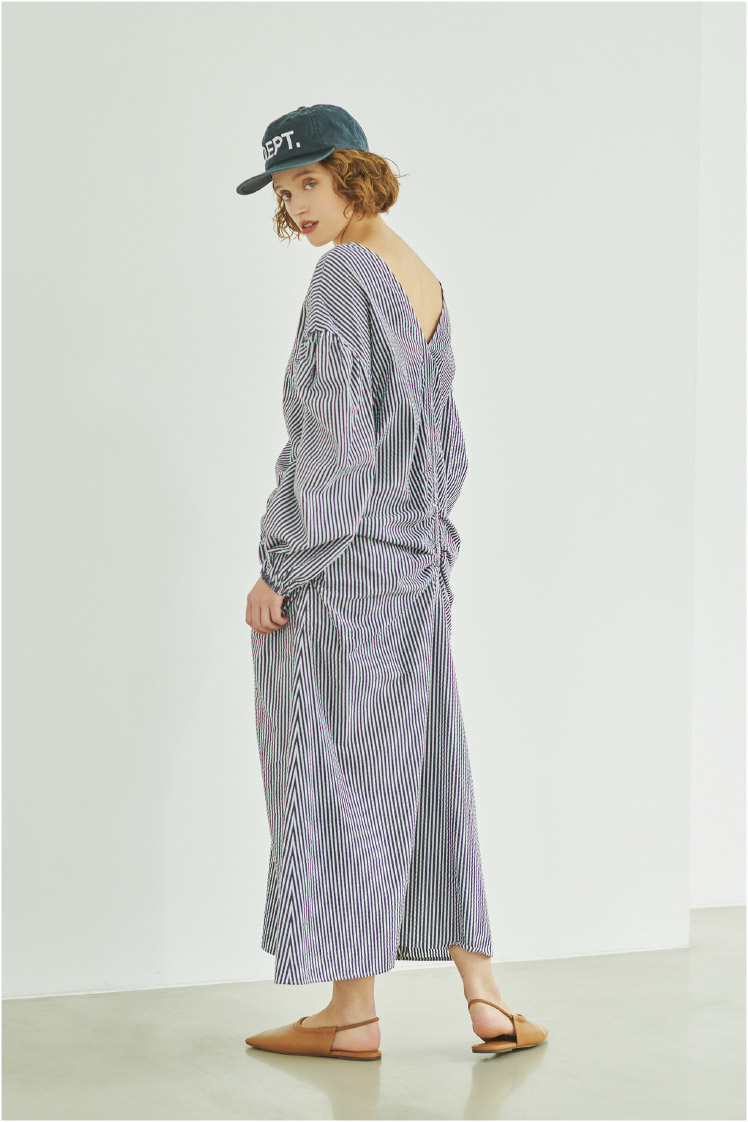 - ふんわりボリュームスリーブや大胆なシャーリングの技ありワンピースは、シンプルに着るだけでサマ見えする一枚。ヴィンテージライクなエッセンスを添えるキャップを、コーデのハズしに投入して。