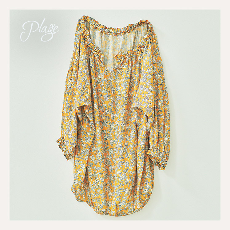 - 春らしい華やかなオリーブ柄のPlageオリジナルブラウス。とろみのある素材感と首周りのギャザーが、上品でフェミニンな印象です。明るいオレンジカラーは限定色。