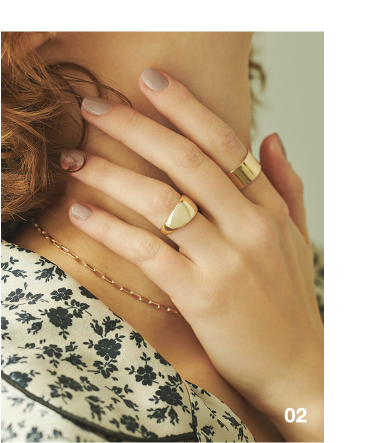 - 02. いくつあっても嬉しいシンプルなリングは、やわらかな甲丸タイプとシャープなストレートタイプを重ね、光の質感ミックスを楽しんで。 トレンドのチェーンネックレスは、華奢なデザインが断然使いやすい。