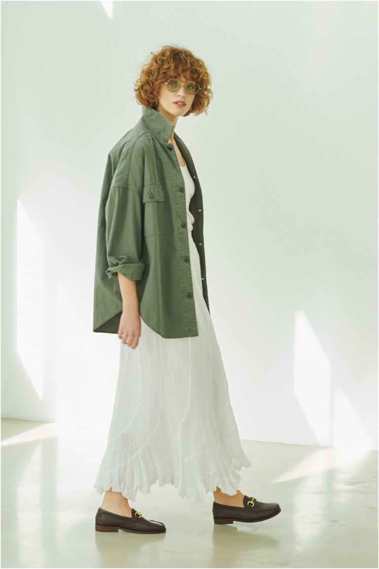 - 夏を先取りするエアリーなマーメイドスカートには、メンズライクなビッグシャツをさらりと羽織って甘辛ミックス。端正な表情のローファーを合わせれば、カジュアルになりすぎず、コーディネートが引き締まります。