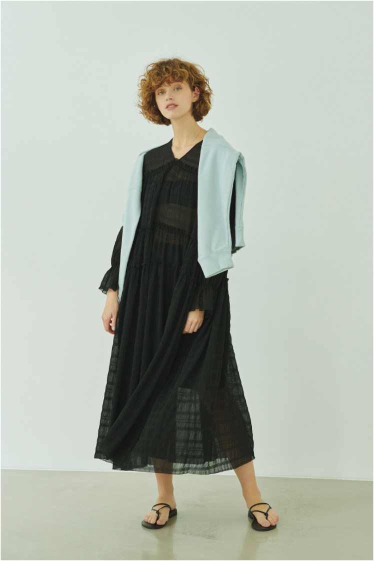 - 今季らしさ満点の透け感ワンピースは、春カラーのスウェットを合わせて、デイリーな着こなしに転換。足元はシックなビーサン風サンダルでこなれ感を演出。
