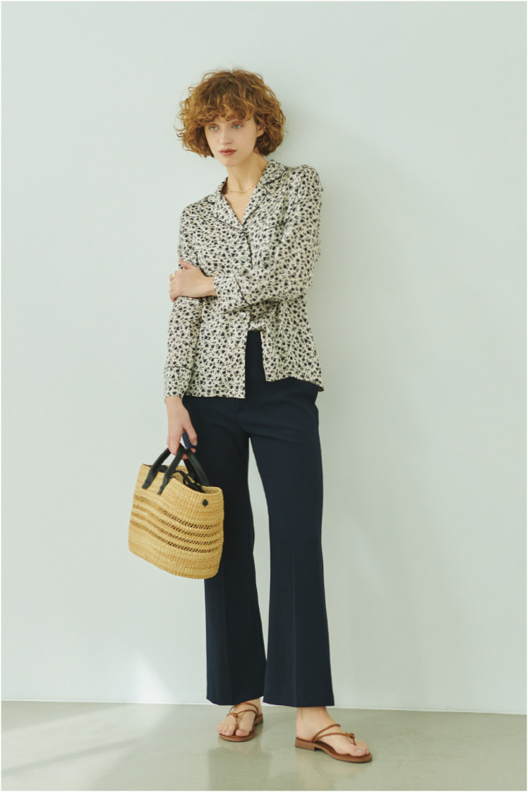 - 抜け感あるシルクのパジャマシャツを合わせて、エフォートレスな着こなしに。レトロ感が旬なネイビーのフレアパンツが、小花柄の甘さを抑えます。カゴバッグで、初夏のムードを先取りして。