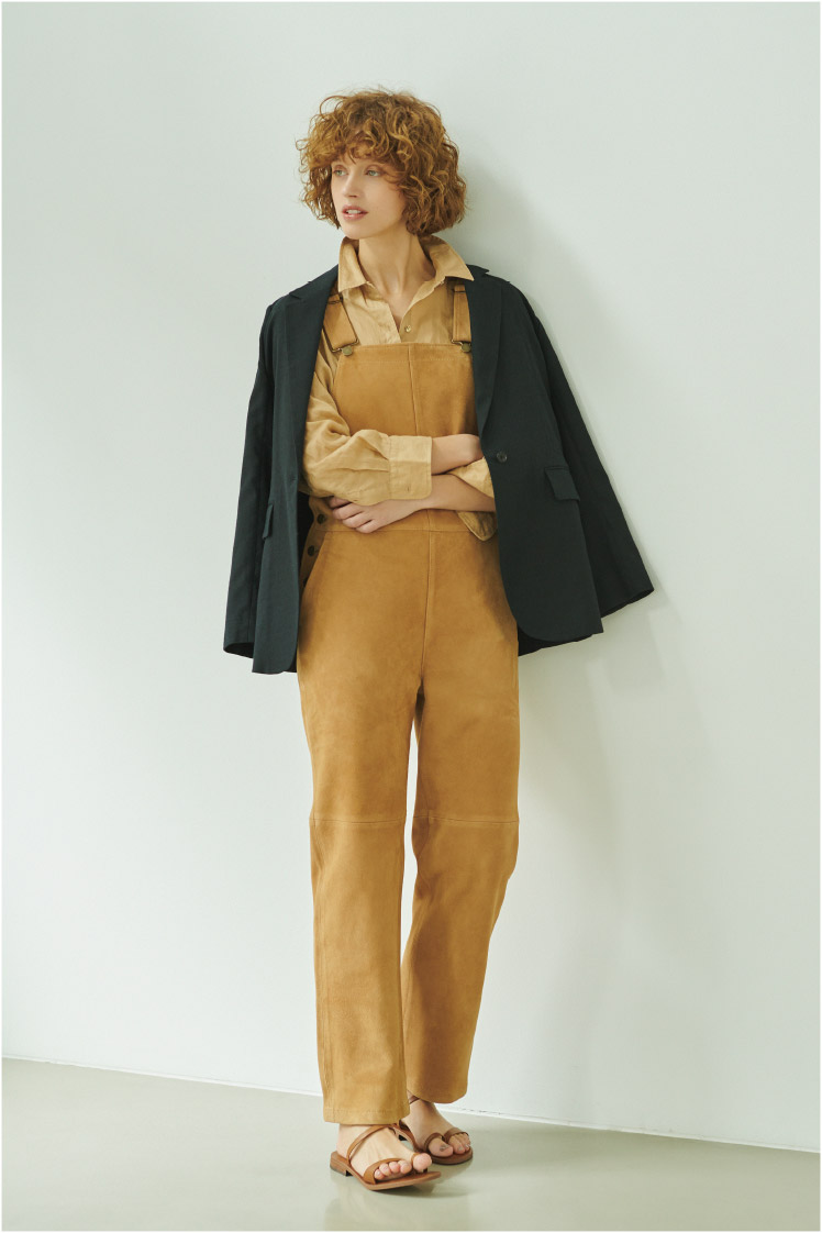 - この春マストのサロペットは、異素材ミックスによるキャメルのワントーンで、シックにまとめて。ジャケットを羽織れば、より大人っぽく着こなせます。足元はヌーディなフラットサンダルで抜け感を出すのが正解。