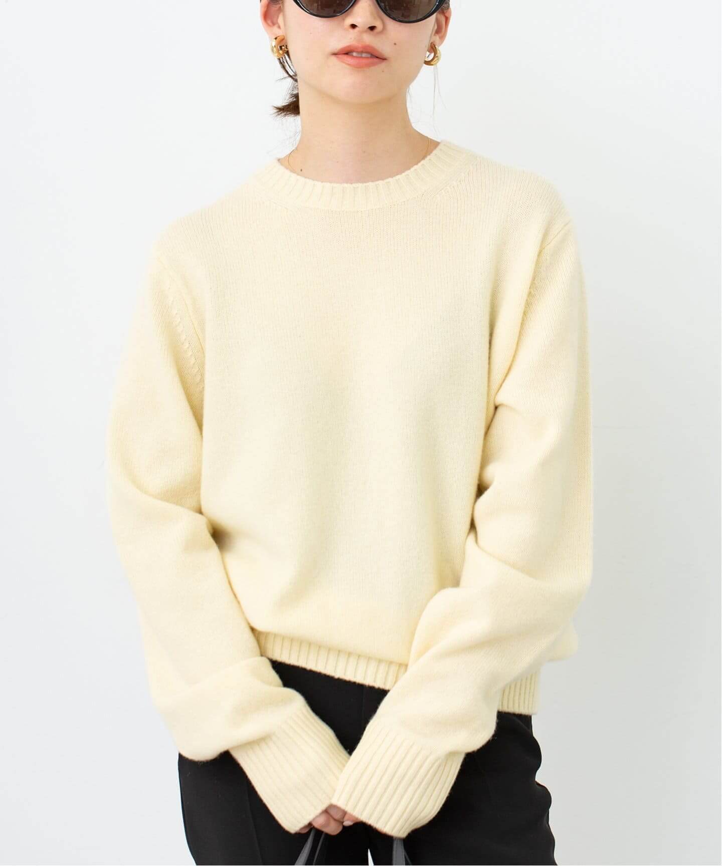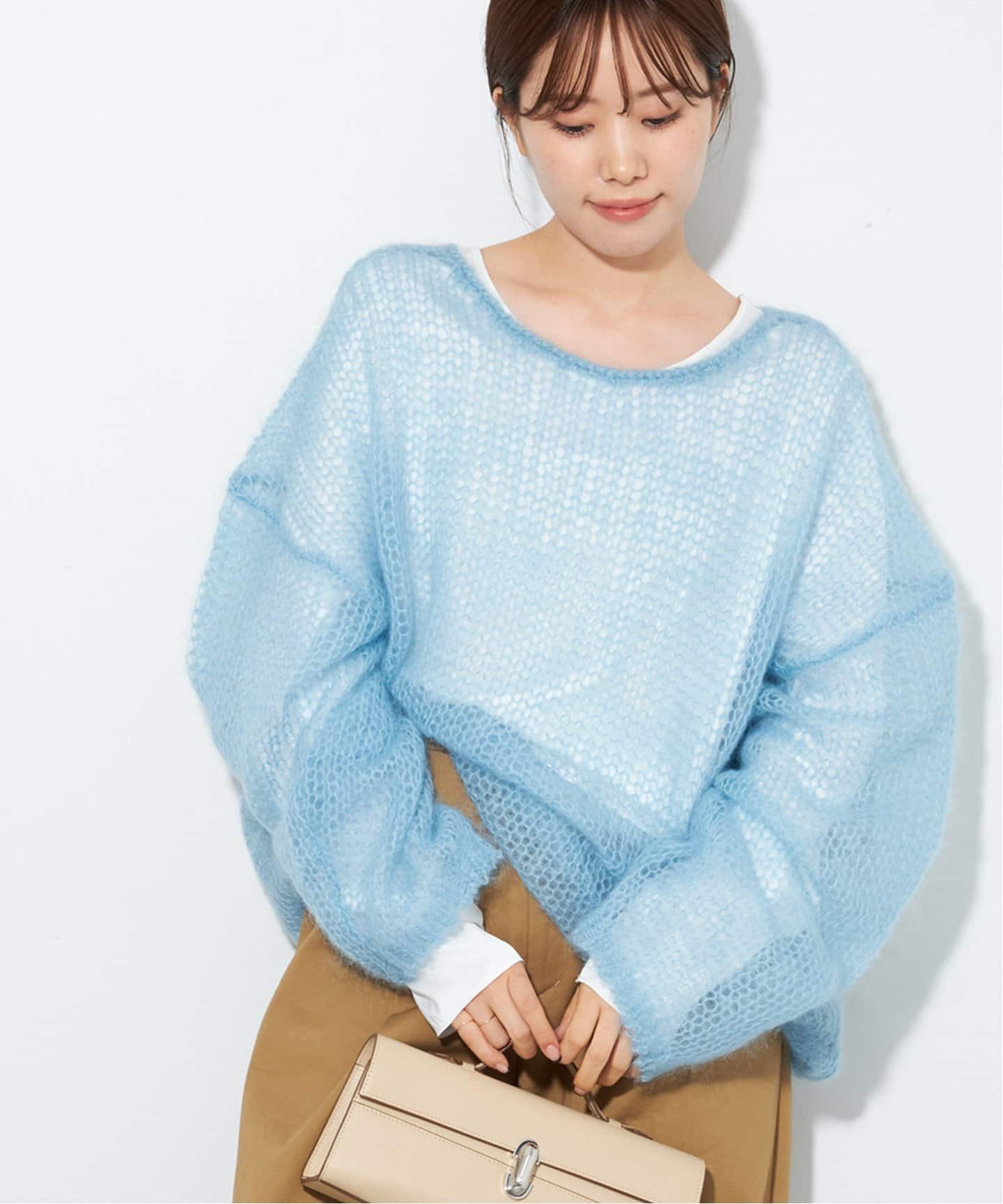 甘すぎないマカロンニットDeuxieme ClasseのNewstandard ニットは、きゅっと詰まったクルーネックでシャーベットカラーの甘さを引き締め。Plageのメッシュモヘヤプルオーバーは、甘すぎず爽やかな印象を引き寄せるブルーがおすすめ。