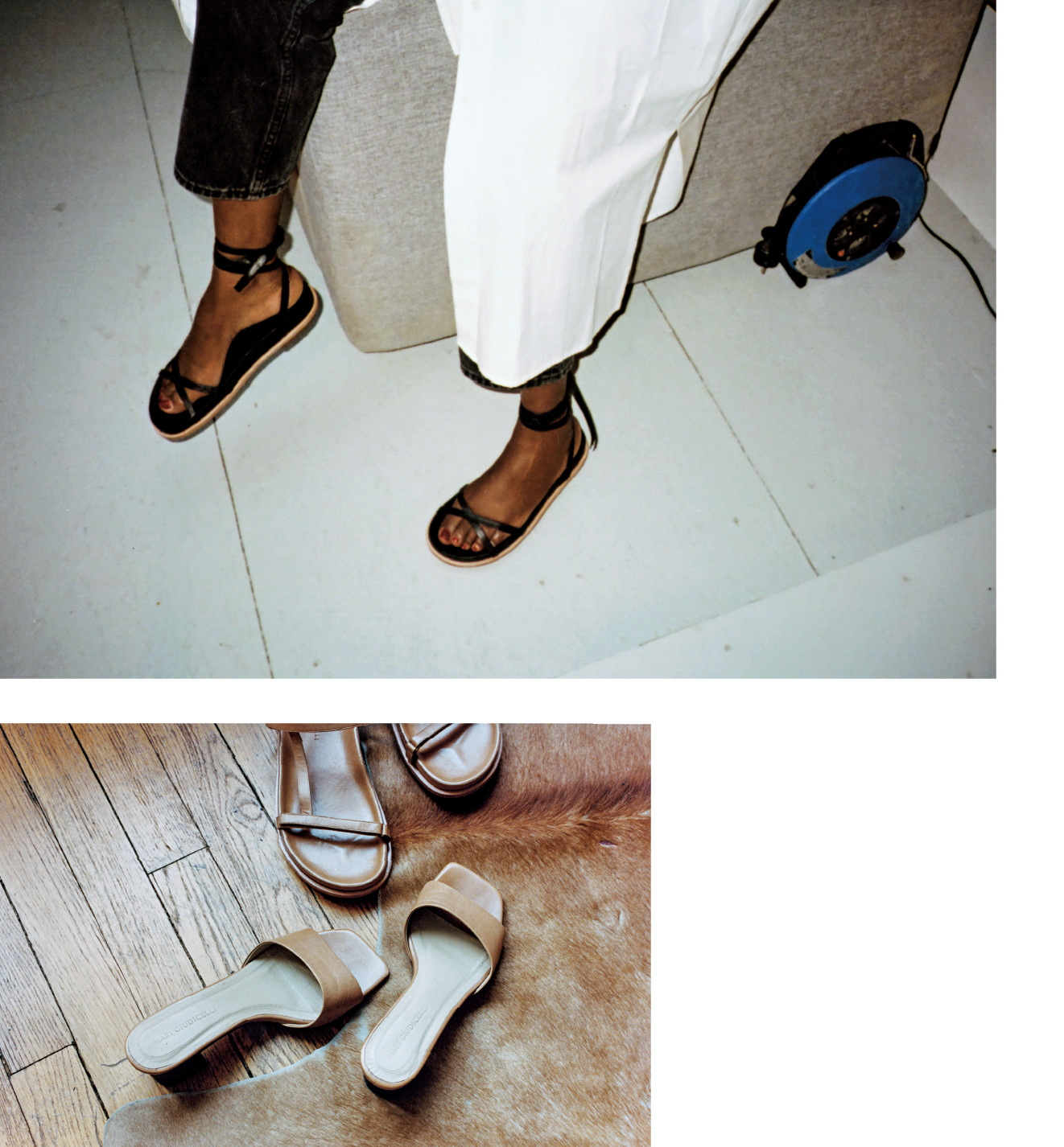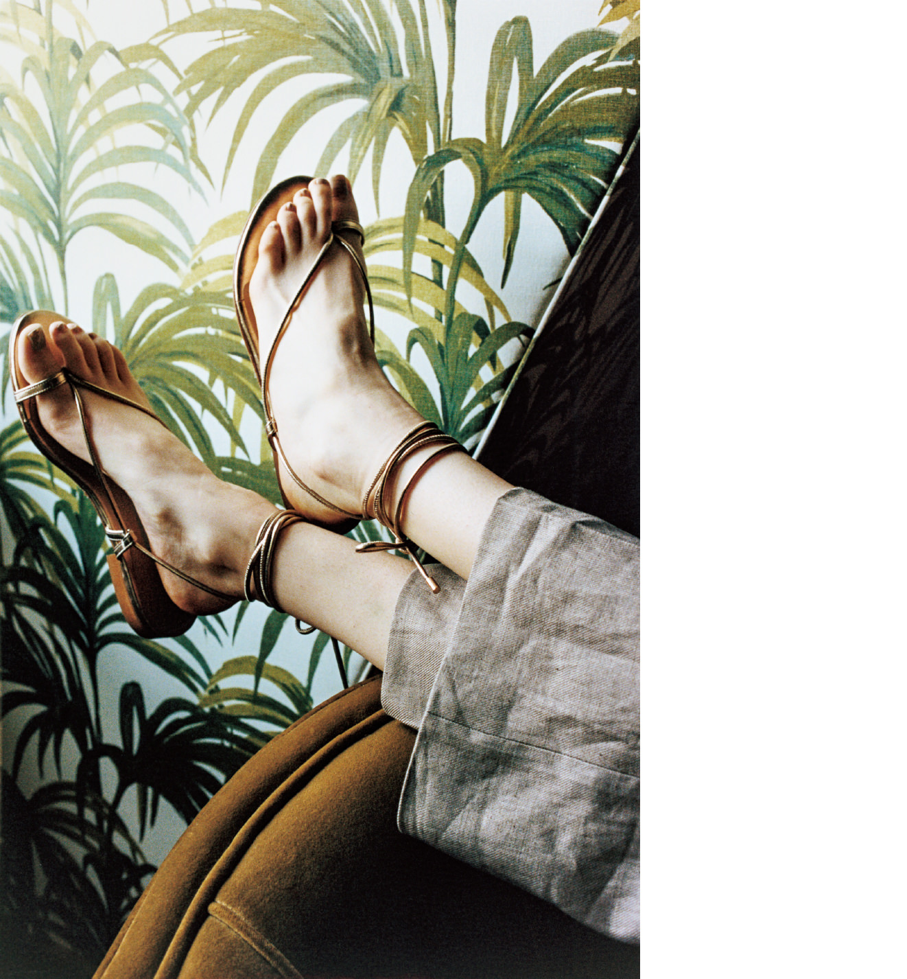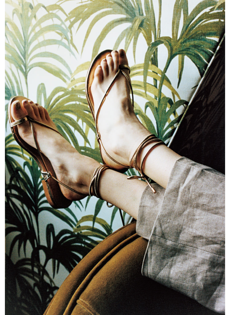 昨年のバカンスで初めて訪れた、ニューカレドニアの小さな離島を思い出している。世界でベスト10に入る美しい白砂を持つビーチで飽くことなく、このサンダルを履いた足を砂に埋めたこと。地球と身体が一体化するような、少し怖いほどの不思議な感覚の中で、こちら側へつなぎ止めてくれたのが、足首にくるくると巻き付けたストラップだったのだと。