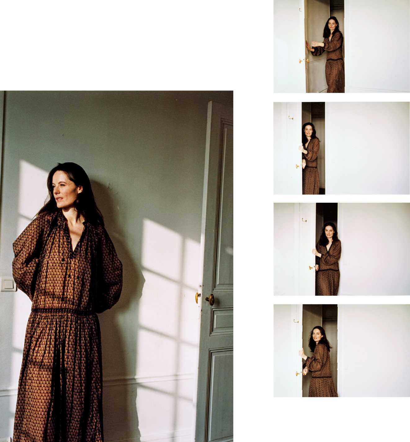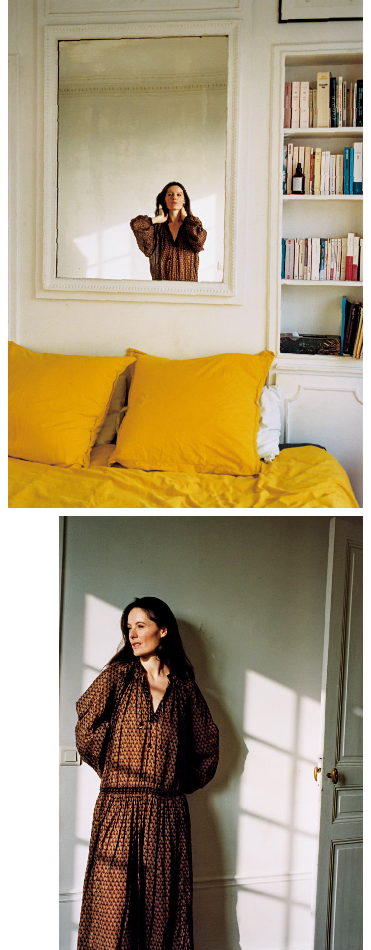 鏡が映し出すのは、見たことのないわたしの表情。ガーゼのように薄い生地で仕立てられたドレスからは、午後の光で肌がほんのり透けている。危ういバランスで肌が透けることは素敵だと思う。強くて自由な感情も、あいまいなニュアンスで伝えてくれる、最強にラブ&ピースなドレス。