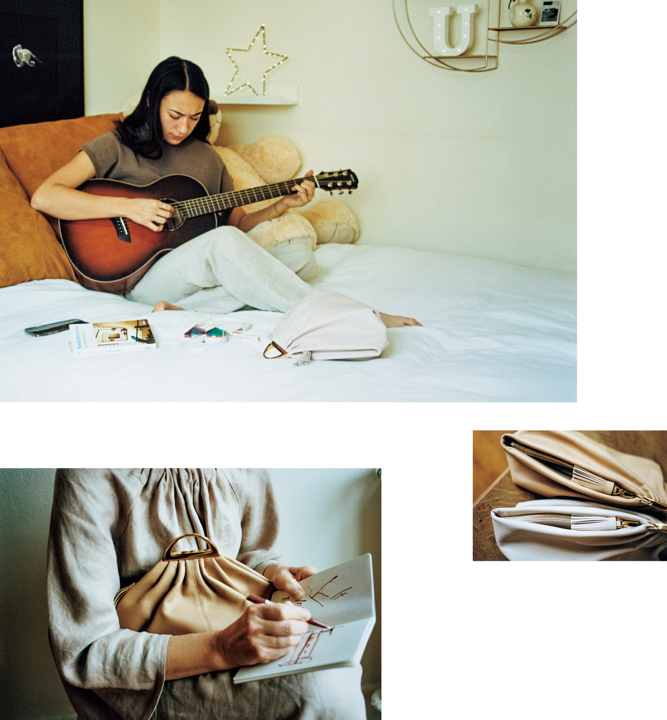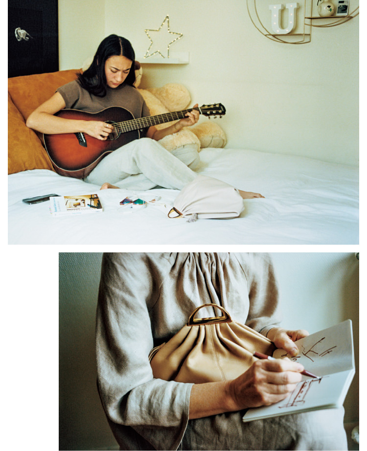 手の動くままに、ペンを走らせ、弦をつまびく。ハーモニー、以心伝心。点心みたいな形をした、小さなクラッチバッグ。薄いベージュと濃いベージュ、ひっそりとフリンジを震わせて、心を通わせる。