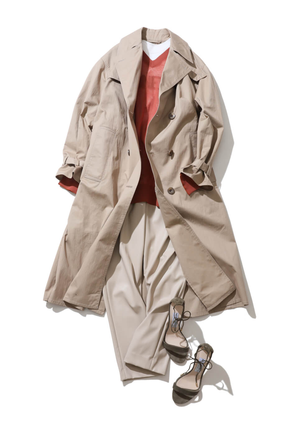ベージュを中心にトラッドな雰囲気でコーデを組み立てつつ、アプリコットニットを差し込んだり、ボトムスはフェイクレザーで今年顔にチェンジしたりと、ディテールを光らせて。今年の春に絶対着こなしたいシアーな質感のニットは、あえてロゴが見えるロンTを重ねてお洒落度を加速。