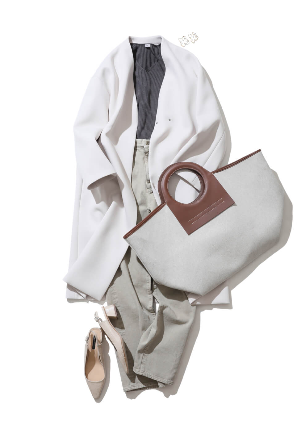 カジュアルなイメージのチノパンを、あえてオフィスコーデのハズしに取り入れて。シンプルだけど好印象なVリブニットとミックスして、さらりと大人っぽく着こなすのがポイント。仕上げに女度を格上げする白コートとワンポイントに光るフラワーピアス、目を引く大きめバッグで今っぽさを添えて。