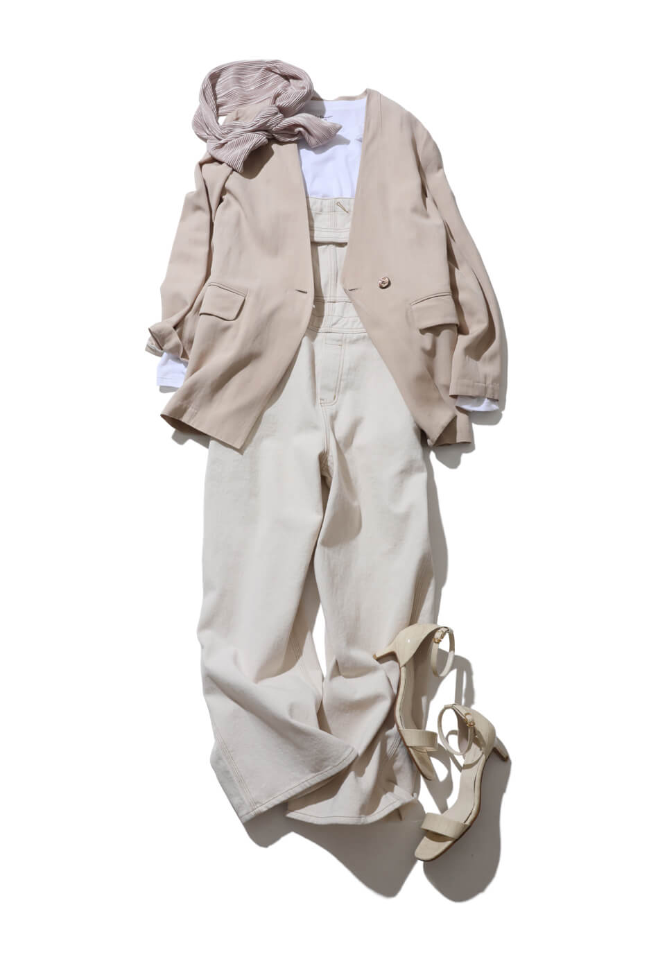 オーバーオールにジャケット、ストラップサンダルをミックスして、幼い印象を回避した大人カジュアルに。白のインナーからナチュラルのつなぎ、仕上げのベージュアウターまで、奥行きのあるグラデーションコーデにまとめることで洗練のムードに。ターバンを巻いてさらにお洒落度を加速させて。
