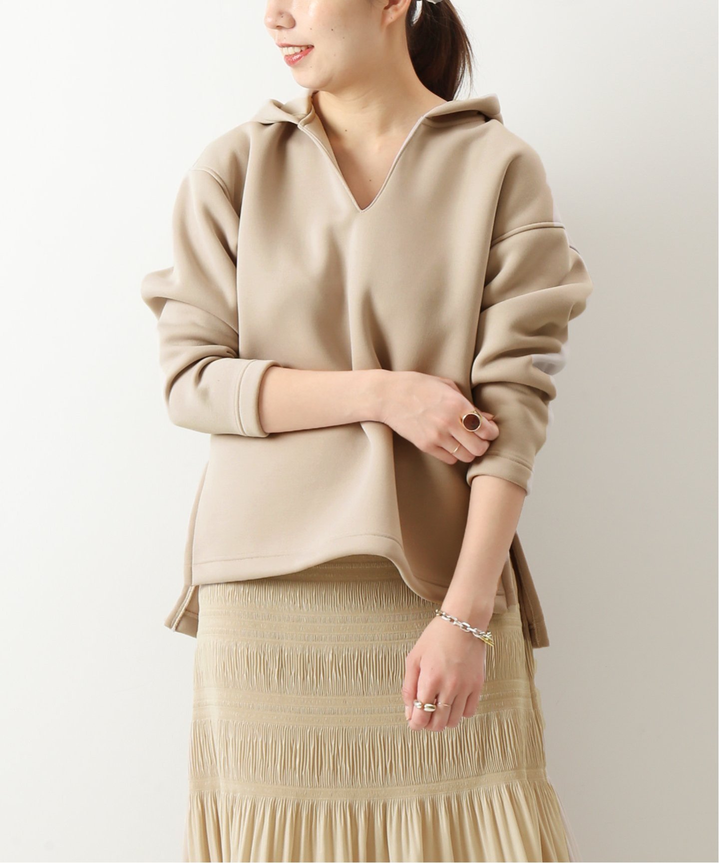 ラウンドネックが鍵スカートにもボトムスにも相性の良い