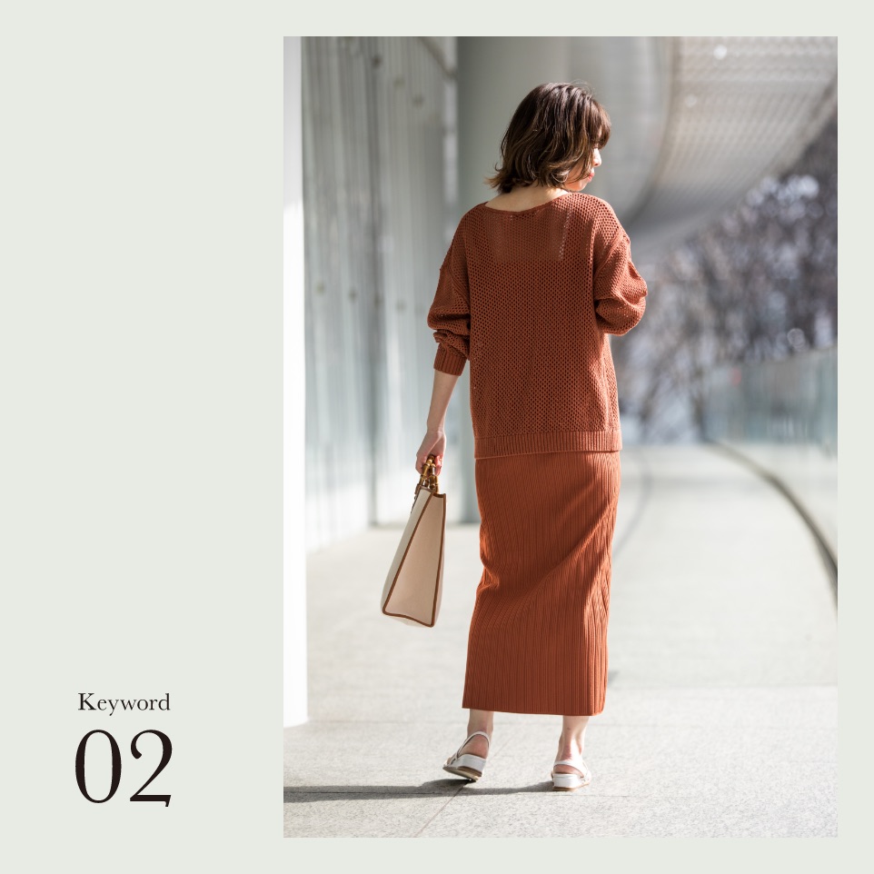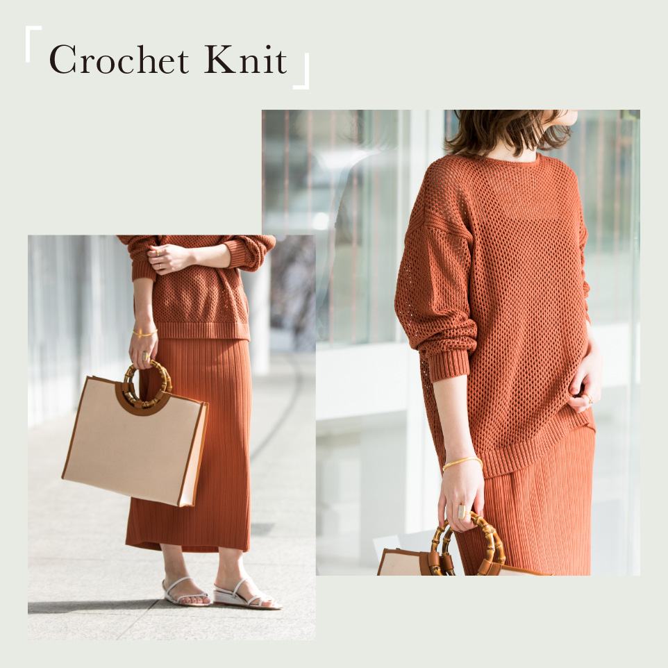 涼しげなカギ編みのクロシェニットがトレンドのニットアップで登場。