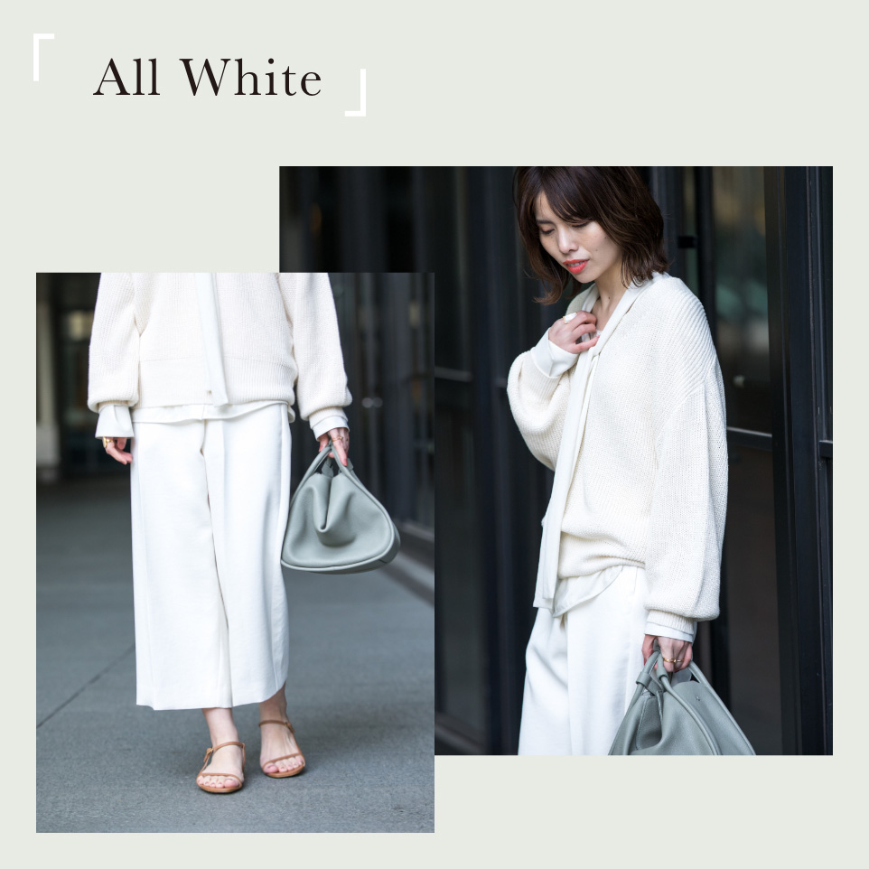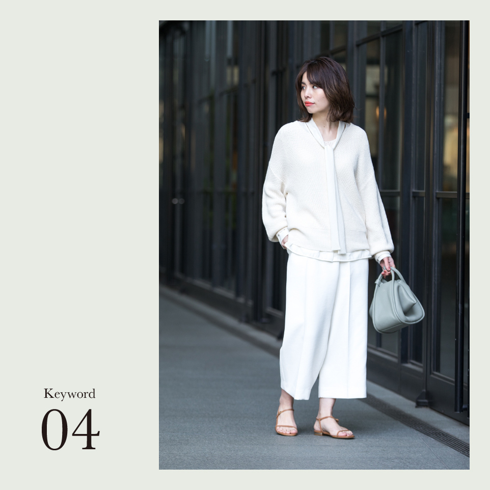 ニット・ブラウス・パンツの異素材をMIXしてポイントで淡いミントグリーンをプラスして余裕ある着こなしに。 - NOBLEボウタイブラウス◆¥17,600(税込)