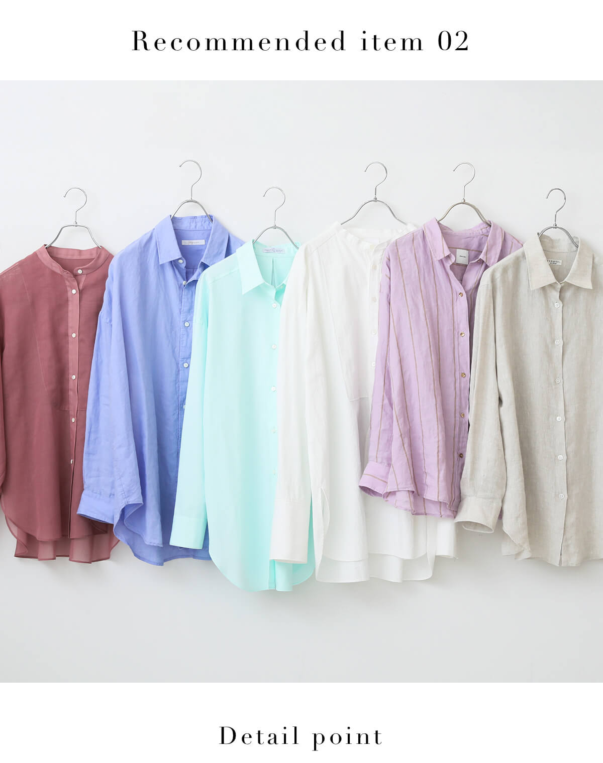 ブルー系からくすみグレー、ラベンダーなど上品な色味がラインナップ。リラックス感とクラス感の両方が手に入るカラーとデザインが嬉しい。オックスフォードやリネンなど、素材によっても印象が異なるので要チェック。特にシアー素材のローズピンクのシャツはトレンド感もありサマーさんにおすすめの1着です! - JOURNAL STANDARD relumeソフトオーガンジーシアーシャツ◆¥11,000(税込)