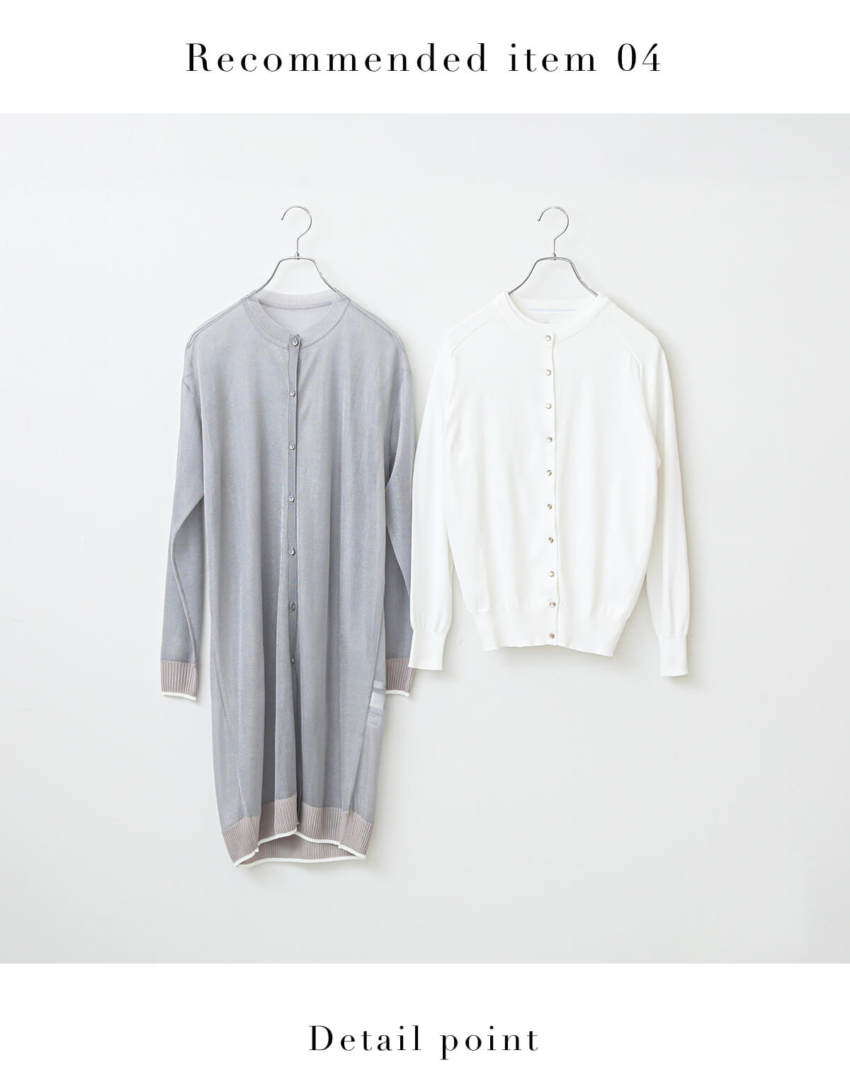 どんな色とも合わせやすいベーシックなグレー&ホワイトのカーディガン。明るめで、真っ白すぎないややニュアンスのある色味を選ぶのがサマーさんへの似合わせポイントです。ホワイトのショート丈は、ベージュのパールボタンがさりげないアクセントで品もアップ。 - JOURNAL STANDARD relumeウォッシャブルシアーニットカーディガン◆¥14,300(税込)