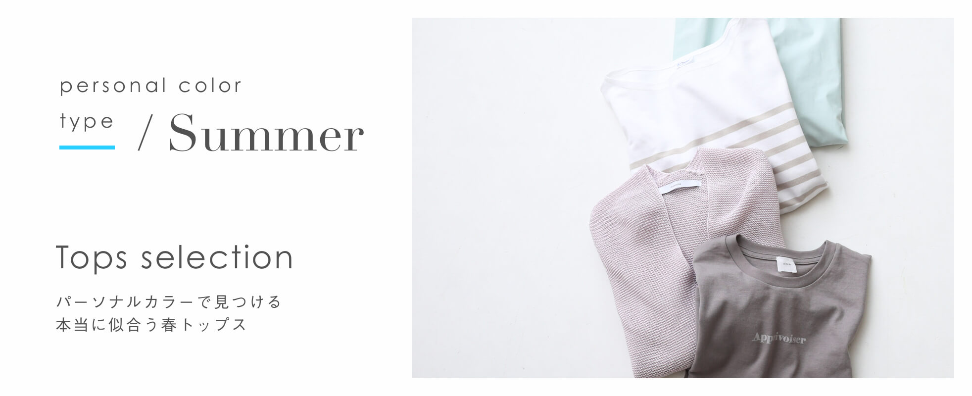 明るめ色の中でも青みのあるダスティカラーが得意なサマーさん。ベーシックカラーはくすみがかったマシュマロホワイトやローズブラウン・チャコールグレーがおすすめ。色物を投入するならラベンダーやミントグリーンなど、優しい色味を上品に着こなしたい。