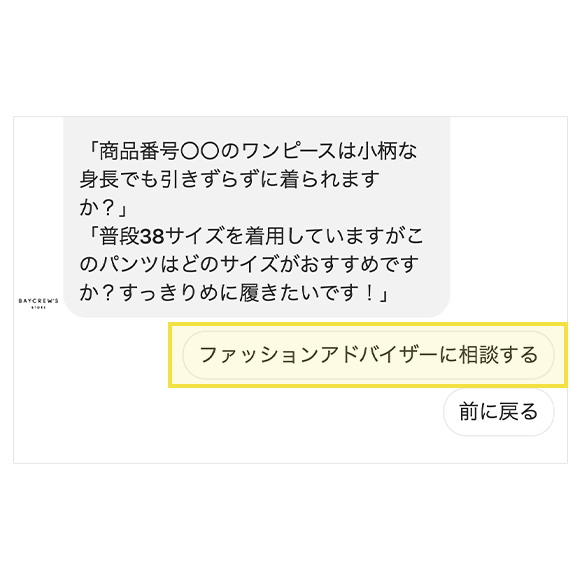 商品の仕様・販売予定・サイズ感等の各商品の詳細についてのお問い合わせはチャットボットではお答えすることができません。