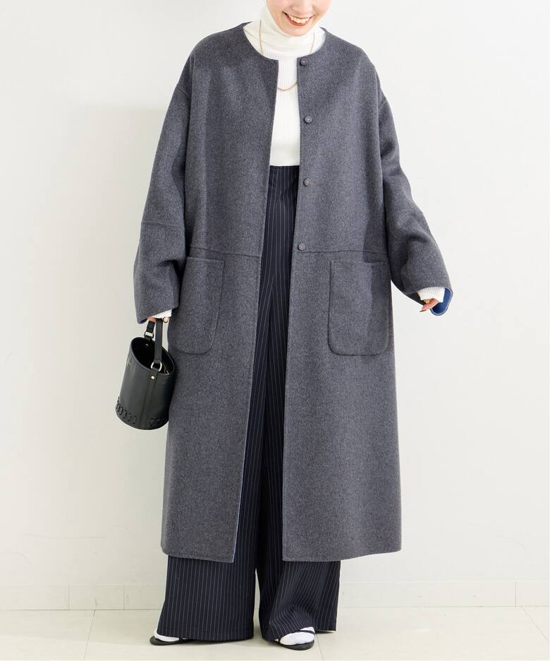グレー×ブルー。 MとSを試着して比較し、スッキリ着たいのでSサイズを購入しました。 裏地のブルーがチラ見えするのが良いです。 裏地なしで薄いコートですので、大判ストールを巻いたりUNIQLOのインナーダウンを着込んで冬中活躍させる予定です。 毛玉が出来やすいかどうか不明なため星ひとつ減らしました。