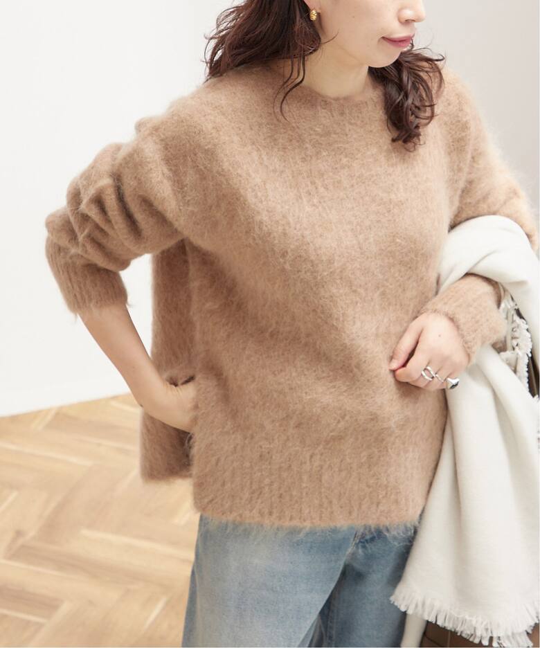 ニュアンスのある深い赤に一目惚れしました。イエローも可愛かったですが、着比べてやはり赤に。モヘアがしっかりしているので少し膨らんだ感じになりますが、ボトムをダークにすると引き締まるしニットの可愛さが出るかなと思います。インナーをクルーネックにしてチラ見せ&首が直接当たりにくくしているのでチクチクはそんなに気になりません。セールなので色チも買うか悩んでます。