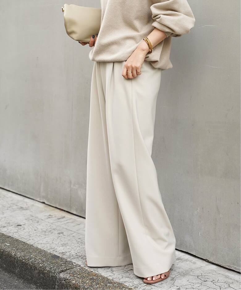 ベージュのワイドパンツが欲しくて店舗で見つけて購入ししました。このパンツかなりワイドですが落ち感がよくぼってりしないので野暮ったくならずラインが綺麗に見えます。ワイドパンツをエレガントに着たい方に是非おすすめします。