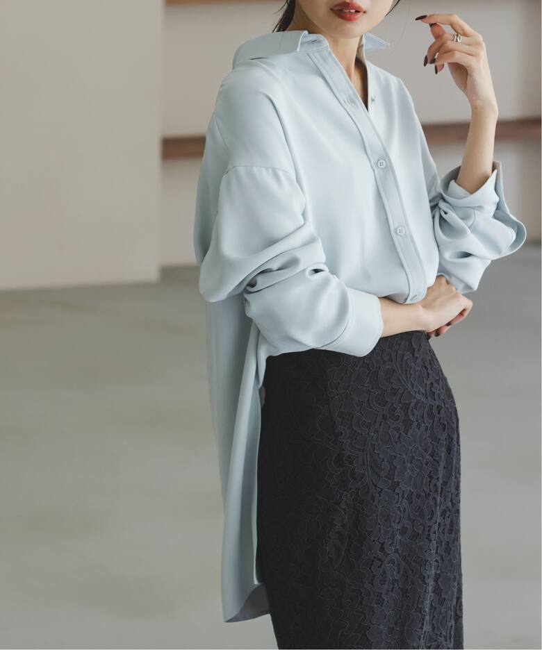 店頭でワイドパンツと試着しワイドパンツのみ購入したのですがこちらがずっと気になっていた所セールになったのですぐ購入しました。 ベージュも良かったですがクールなこちらの色味も好きです。 ナチュラル体型の為オーバーサイズや体が泳ぐ感じのコーディネートが得意の為ワイドパンツにこちらのシャツをインせずに着るとかなり体型にあったコーディネートになります。
