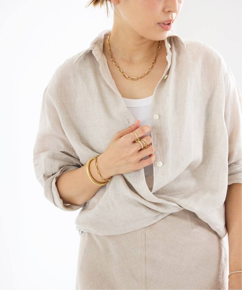ショート丈のリネンシャツのホワイト色も購入したので、此方は合わせやすいベージュ色にしました。 裾を交差するとカシュクールになり、襟にはワイヤーが入っているので襟の立ち上げがしやすいです。 ベージュ色が淡い色だからか顔映りも良く洋服の合わせがしやすいのでお勧めなリネンシャツです。 真夏前から沢山ヘビロテしそうです。