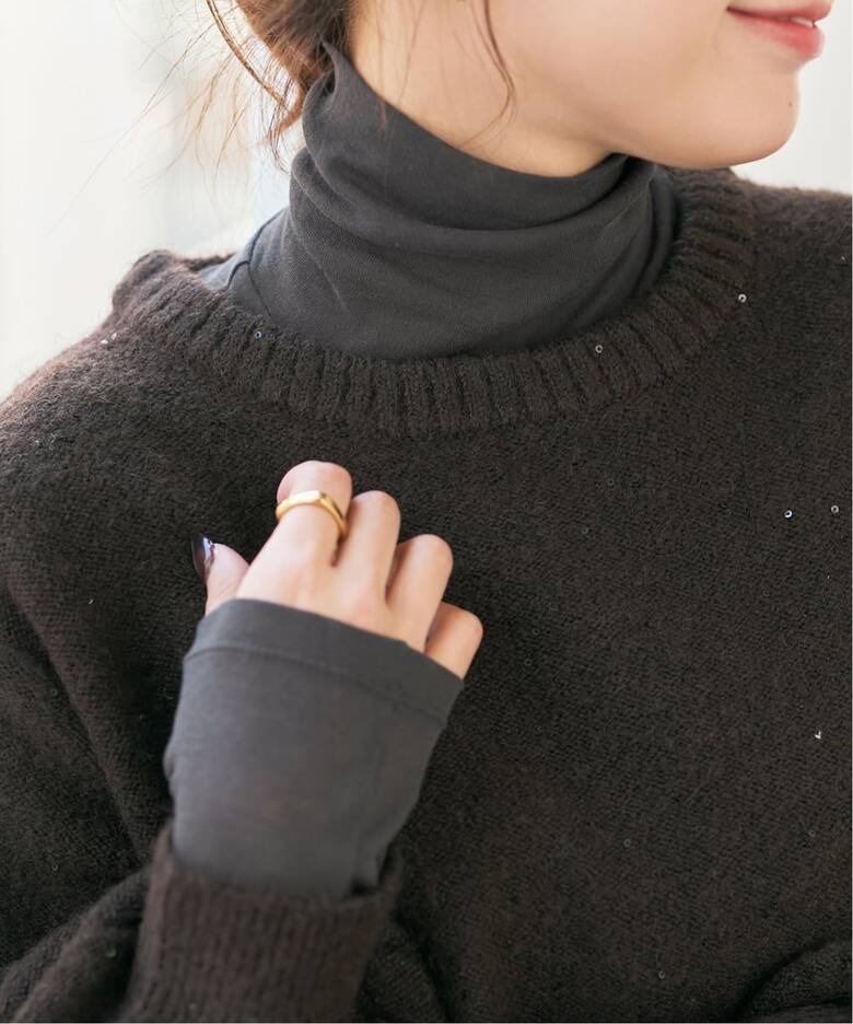 黄色のシアーカットソーはノーマークでしたが、ニットの差し色に店員さんが合わせてくれたコーデが可愛くて思わず購入してしまいました。 茶色やグレーのニットに相性が良く、シアーなので肌馴染みもよく、顔まわりも明るく見えます。ニット1枚で着るのに飽きた時は、このインナーを1枚いれるだけで新鮮になり、気分も変わります。シアーですがきちんと暖かく、綿なので着心地も良いです。