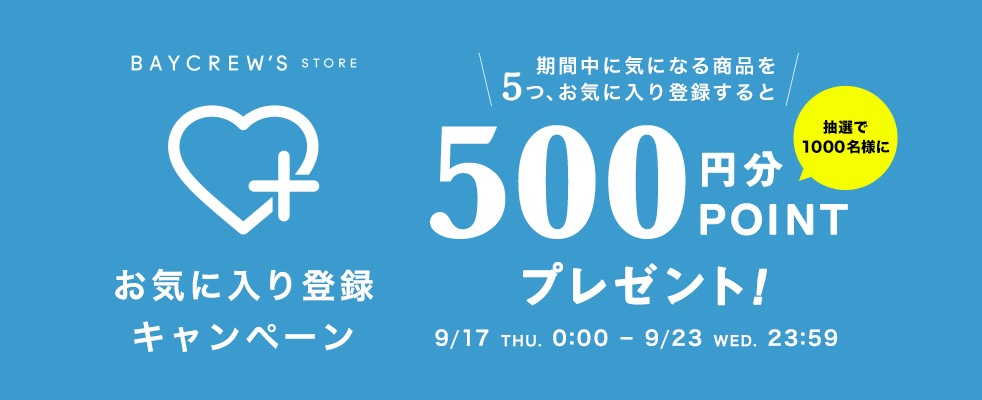 期間中、お気に入り商品を5点以上登録いただくと抽選で1000名様に500円分のポイントプレゼント!