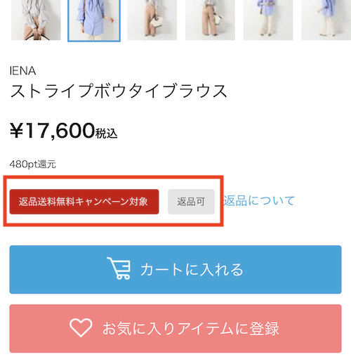 - 商品ページに「返品送料無料キャンペーン対象」「返品可」と記載がある商品