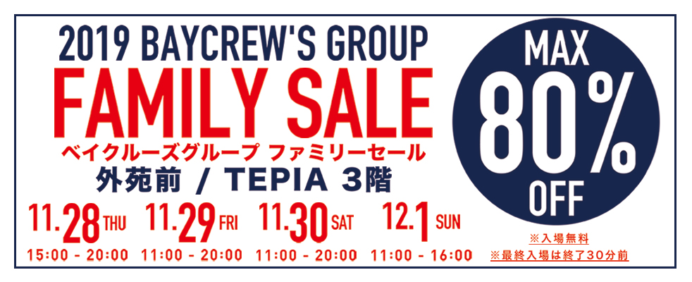 【EVENT】ベイクルーズグループファミリーセール 外苑前/TEPIA 3Fエキシビションホール 11/28(木)〜12/1(日)まで開催!