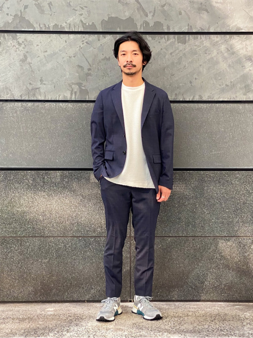 インナーにはカットソーをチョイスし、キメ過ぎない大人な雰囲気に。