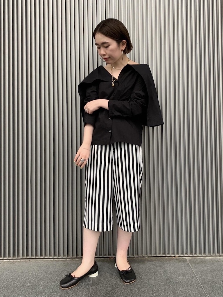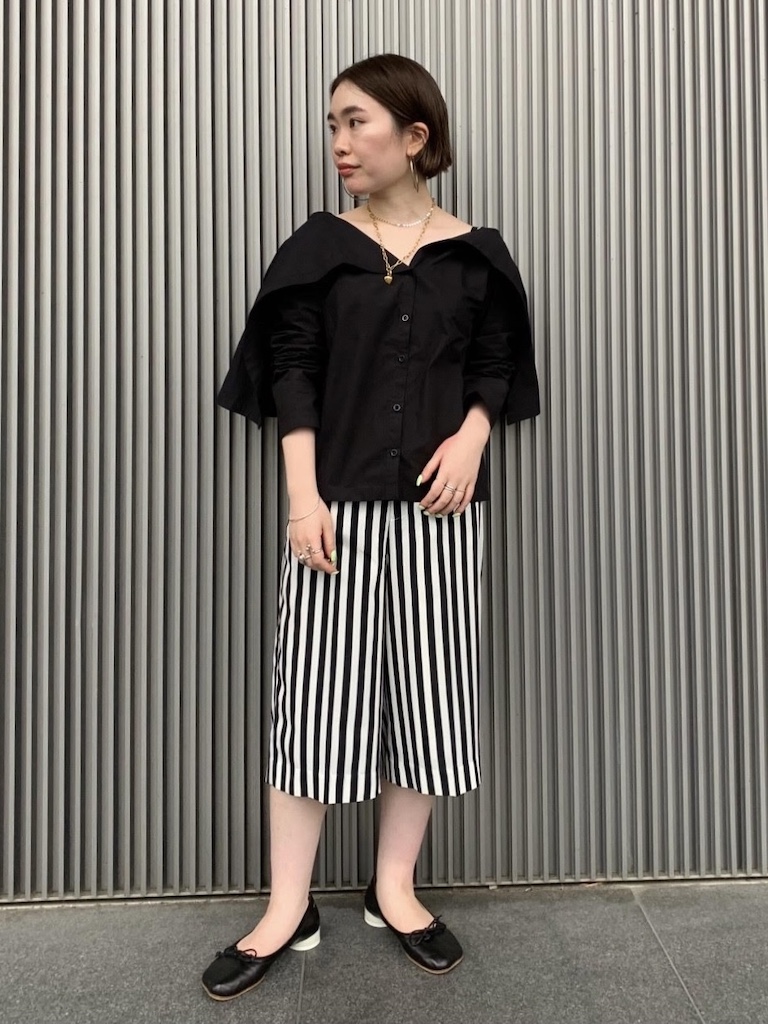 今回は低身長代表のSUZUKIがご提案♪まずトップスは、毎シーズン人気のBASERANGEからBLACKのシリーズをセレクトしております。その中から、今回はbigcollarが特徴的なシャツを着てみました。 デコルテ周りがしっかりと見えるデザインで